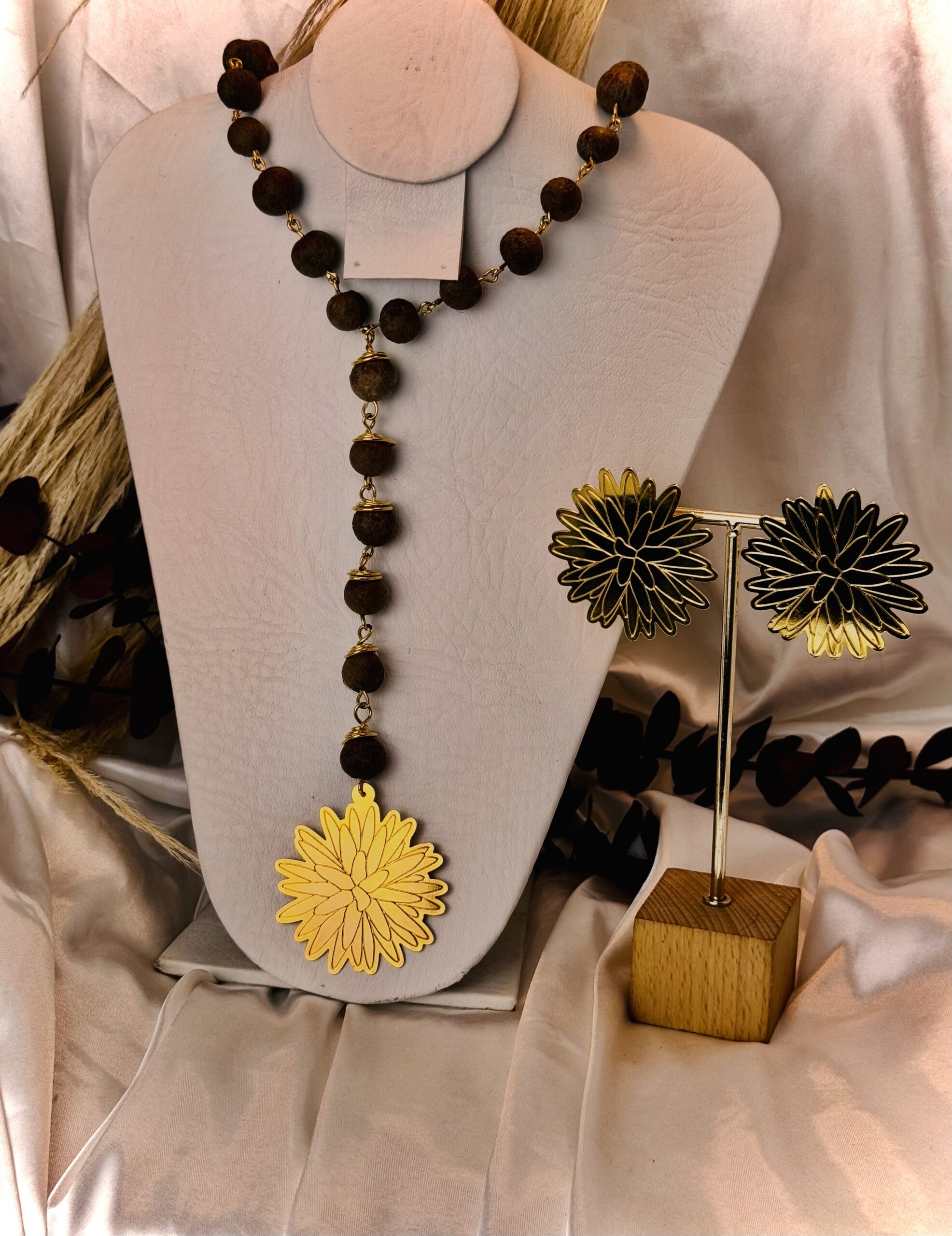 Camándula elaborada a mano con semillas de naidi enredadas en alambre de bronce bañado a oro de 24 k y simbolo de la flor del inirida al final